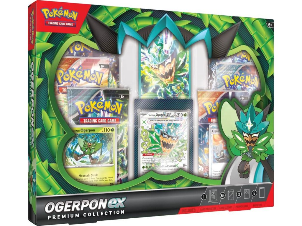 Pokémon TCG: Ogerpon ex Premium Collection je speciální dárkové balení, které přináší legendárního Pokémona Ogerpona v jeho Teal Mask formě jako Tera Pokémon ex. Tato kolekce je ideální pro sběratele i hráče, kteří chtějí obohatit svou sbírku o exkluzivní karty a doplňky.