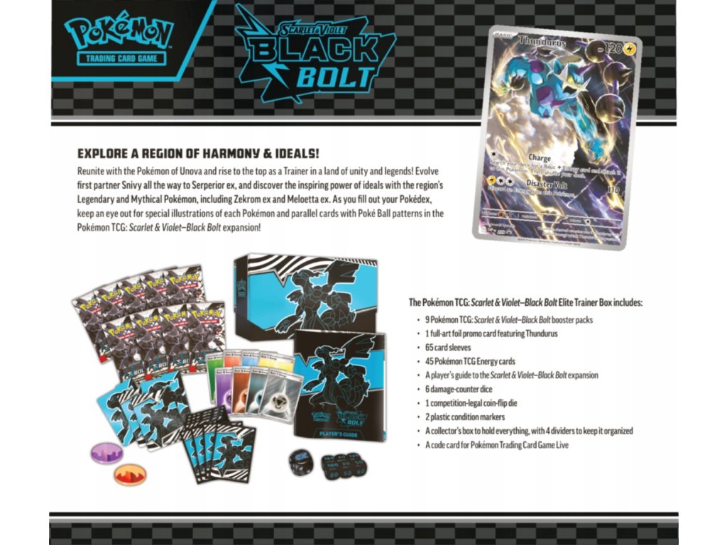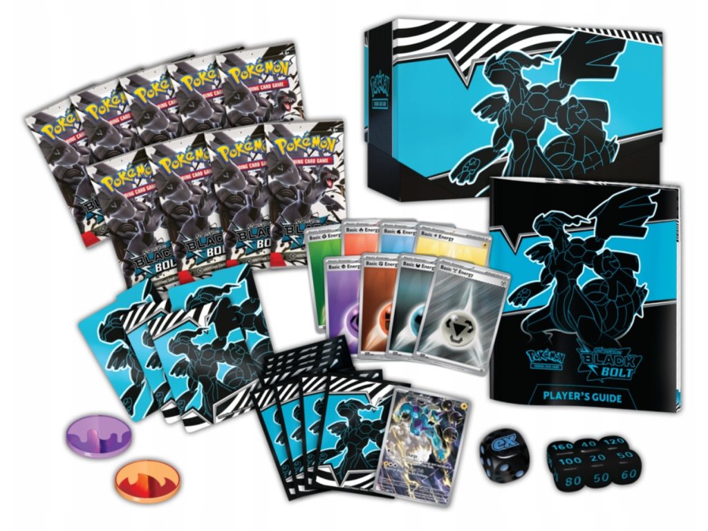 Elite Trainer Box z edice Black Bolt je ideálním způsobem, jak začít svou cestu v této nové edici. Tento box obsahuje množství užitečných předmětů a karet, které vám pomohou na vaší cestě stát se mistrem Pokémonů.