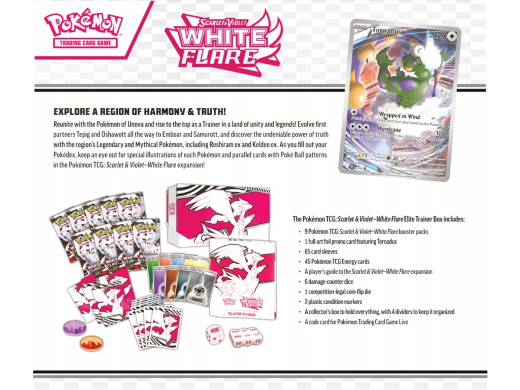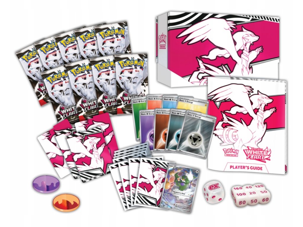 Elite Trainer Box z edice White Flare je ideálním způsobem, jak začít svou cestu v této nové edici. Tento box obsahuje množství užitečných předmětů a karet, které vám pomohou na vaší cestě stát se mistrem Pokémonů.