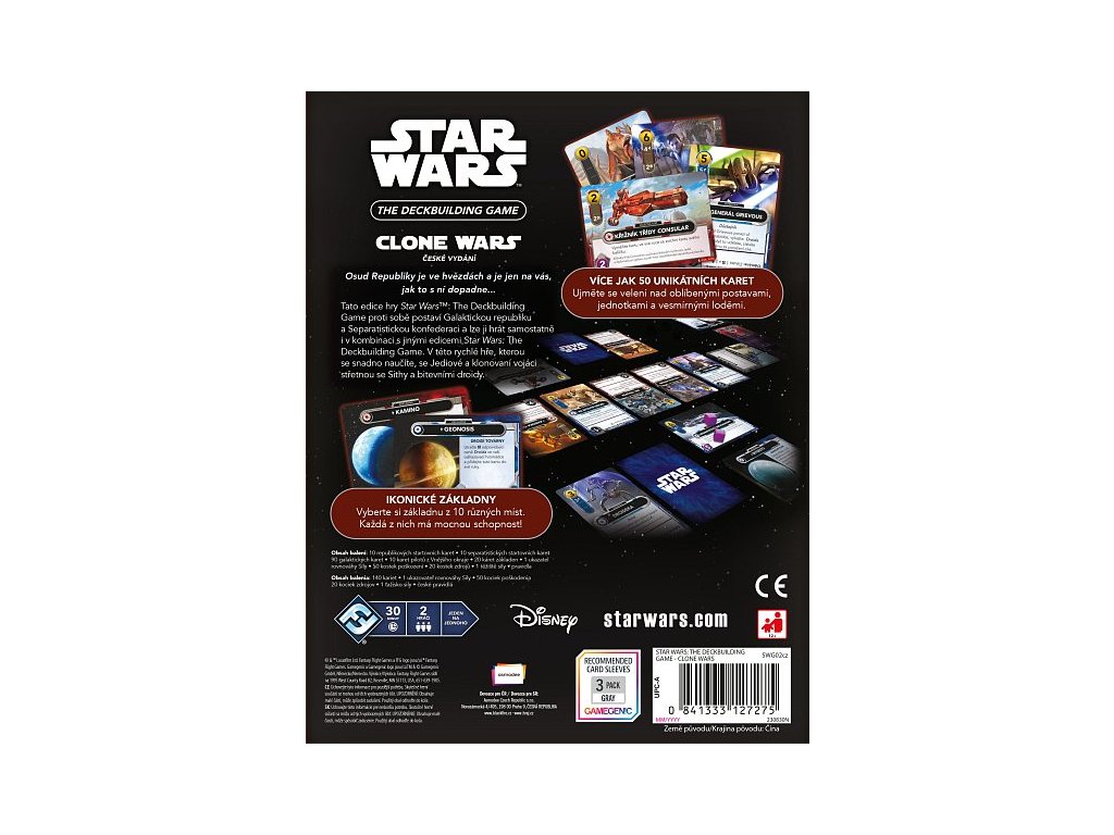 STAR WARS™: THE DECKBUILDING GAME – CLONE WARS je kompetitivní hrou pro dva hráče, která na váš stůl přenese válku mezi Galaktickou republikou a Separatistickou konfederací probíhající napříč celou galaxií. Vy a váš soupeř si vyberete mezi Republikou a separatisty. V průběhu hry budete svůj startovní balíček posilovat kupováním karet, které vám zajistí větší palebnou sílu a přidají vám zdroje, abyste mohli napadnout a zcela zničit nepřátelskou základnu. První hráč, který soupeři zničí tři základny, vyhrává hru!