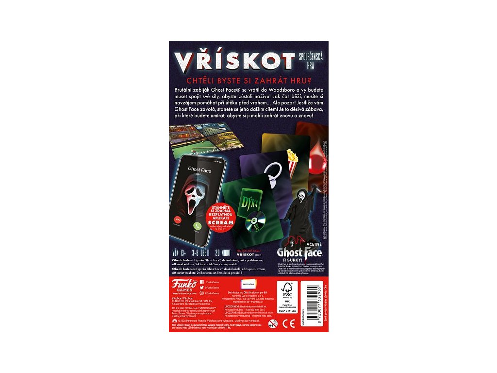 Vřískot je kooperativní hra, která se odehrává v reálném čase. To znamená, že hráči závodí s Ghost Facem, aby zůstali naživu – což, jak asi tušíte není ta úplně nejvhodnější chvíle, dát si popcorn. Spolupracujte a snažte se hrát co nejrychleji, abyste si dobrali a vyměnili karty, které potřebujete. Pokud se vám podaří vyřešit všechna místa činu před vypršením času a zabitím některého z hráčů, všichni se stanete vítězi hry!